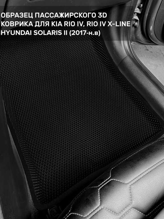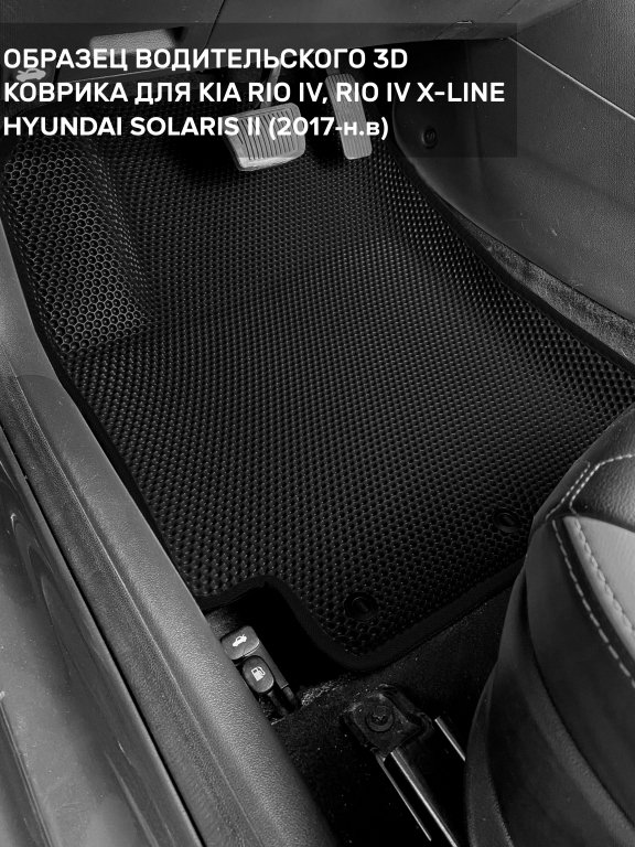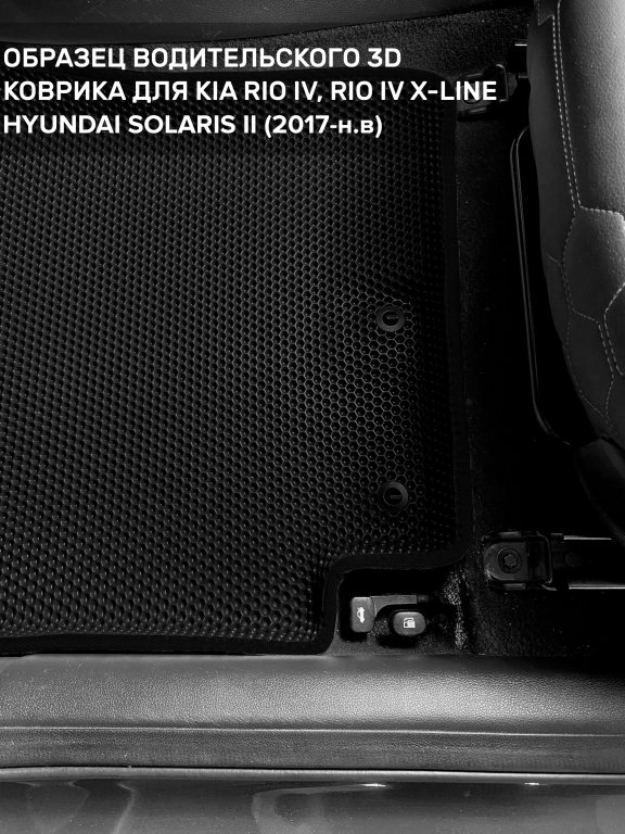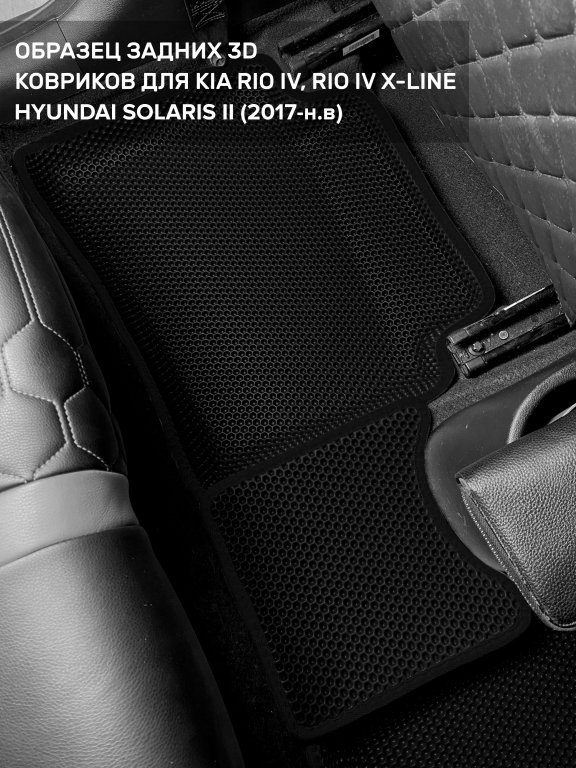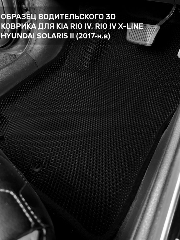 Автомобильные 3д коврики для Kia Rio IV X-Line (2017-н.в.) в салон авто и багажник сделаны из инновационного полимерного материала EVA, изысканная структура в виде ячеек не дает воде, пыли и снегу разлетаться по салону машины и багажнику. 3д коврики зафиксированы на полу определенными клипсами, соответствующими Kia Rio IV X-Line (2017-н.в.), и не двигаются в процессе езды.
